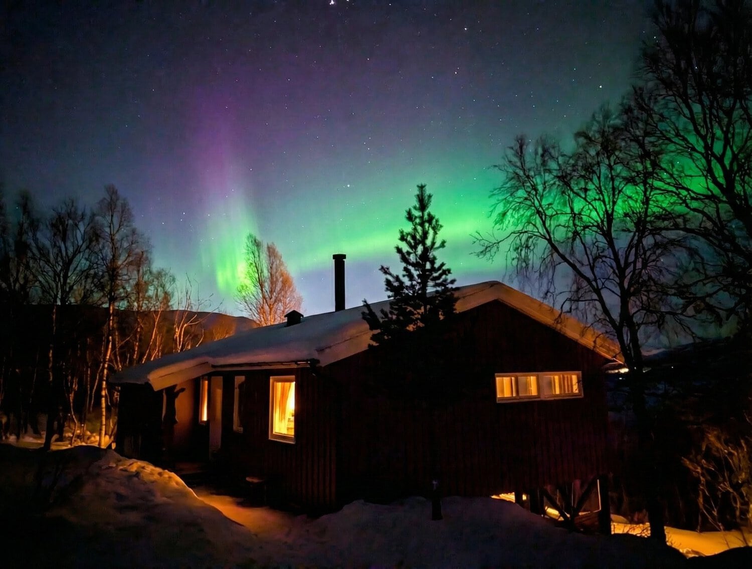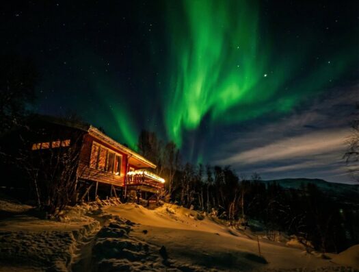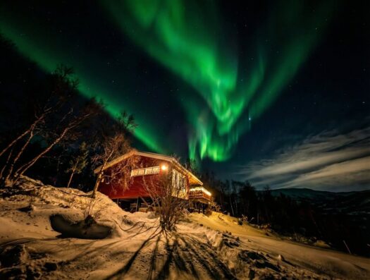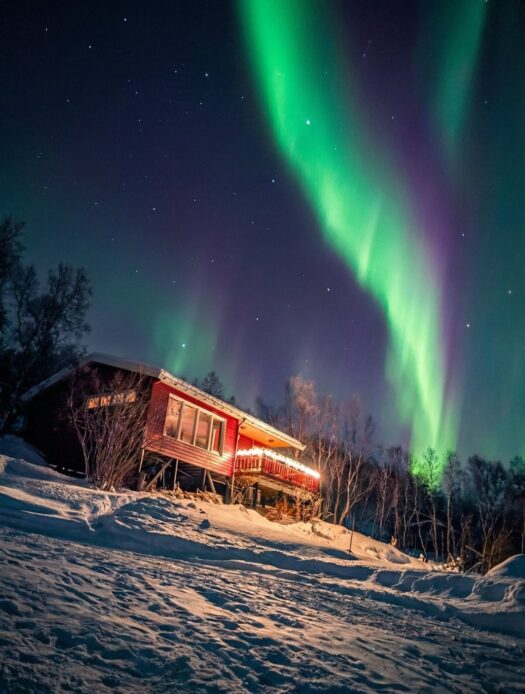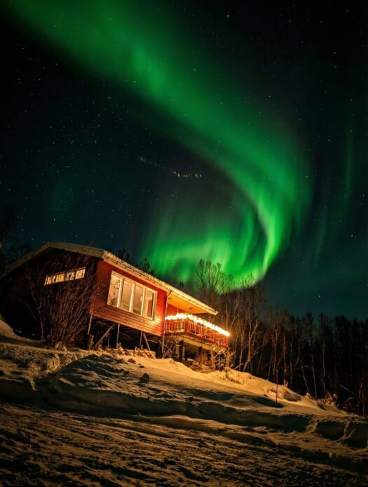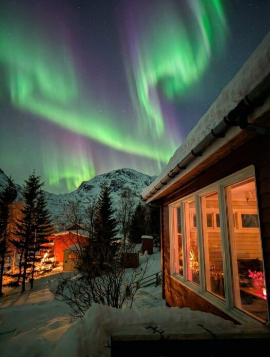 Den Nachmittag verbrachten wir gemütlich mit leckerer Schokotorte in unserer Hütte. Der krönende Abschluss folgte am Abend: Wir konnten einfach vom Sofa aus beobachten, wie die Polarlichter direkt über uns tanzten. Ein Lichtspektakel über unseren Köpfen, bei dem die Welt für einen Augenblick den Atem anzuhalten scheint. ✨