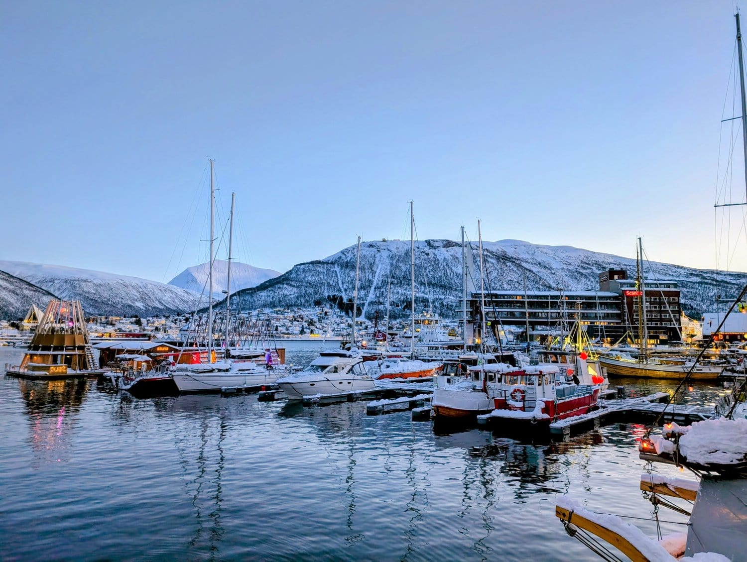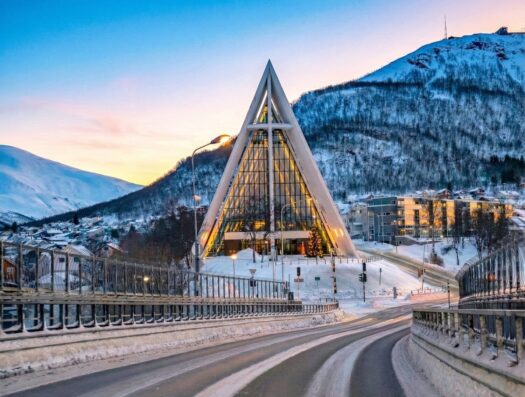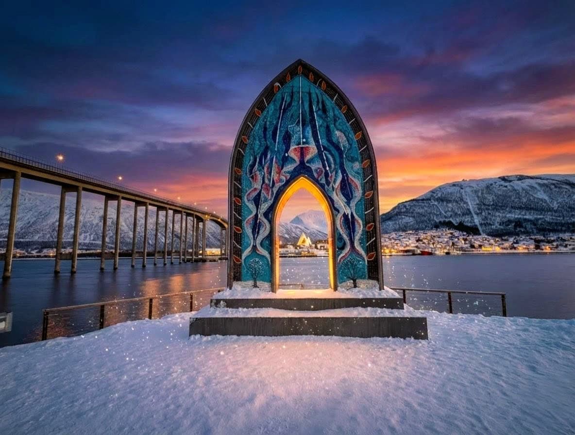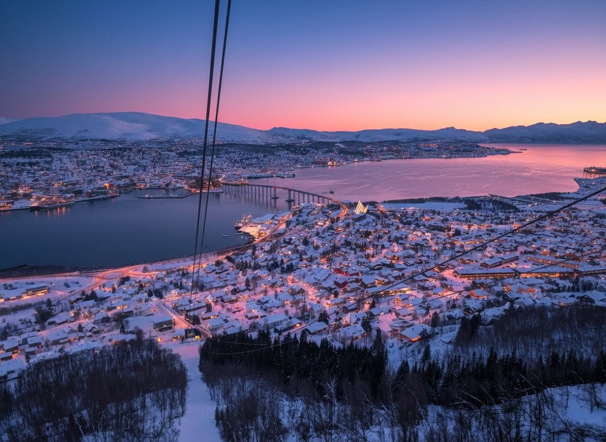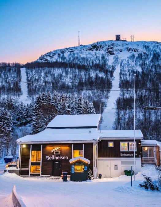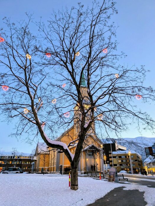 Während die Geburtstagstorte zu Hause in der Hütte langsam auftaute, machten wir uns auf den Weg nach Tromsø. Wir besuchten die berühmte Eismeerkathedrale und fuhren mit der Gondel Fjellheisen auf den Storsteinen. Von dort oben hat man einen phänomenalen Blick über Tromsø und die umliegende Fjordlandschaft. Die Gondel fährt bis Mitternacht, da man von hier aus natürlich auch perfekt die Polarlichter bestaunen kann (oder im Sommer die Mitternachtssonne). 🚠❄️🏔️