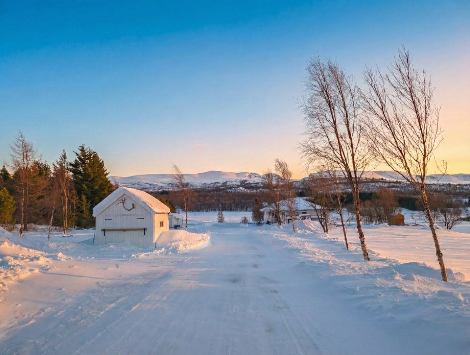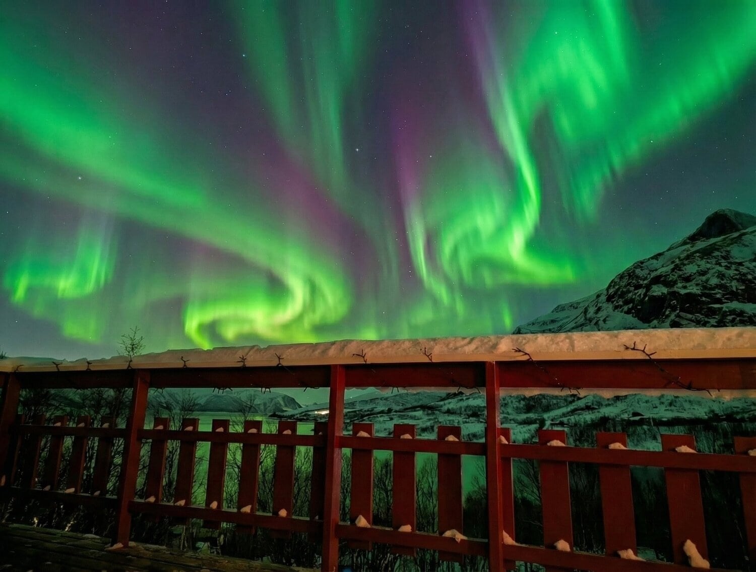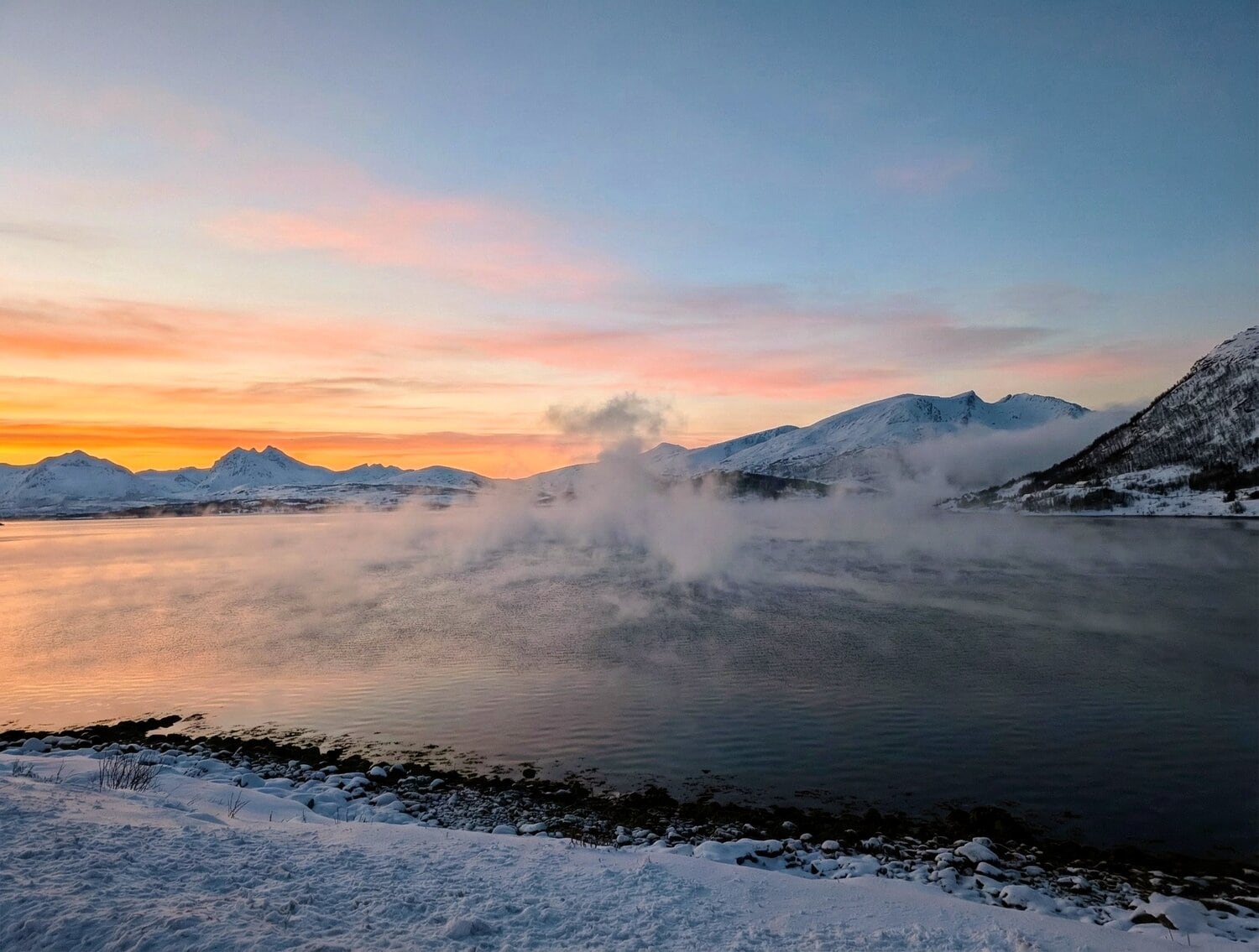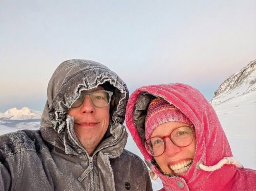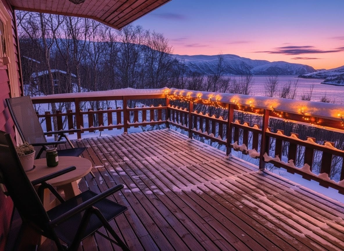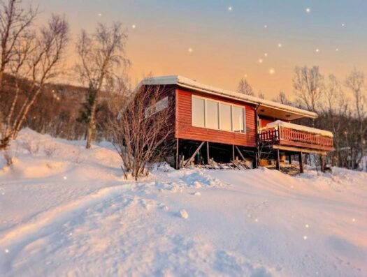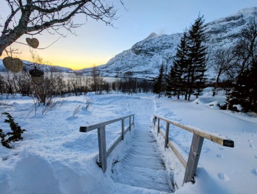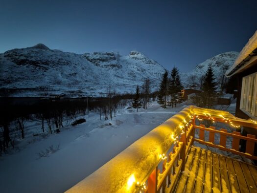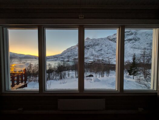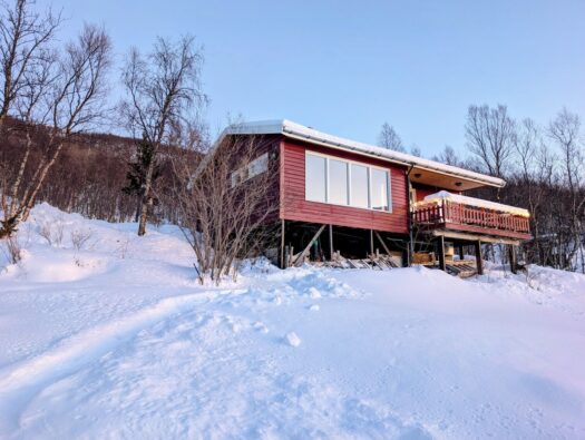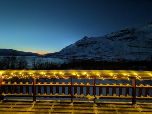 Den zweiten Tag starteten wir mit einem ausgiebigen Frühstück und ließen den Blick über den Fjord schweifen. Da wir uns mitten in der Polarnacht befanden, wurde es tagsüber nur für wenige Stunden „hell“. In dieser Zeit schillert der Himmel in einem zarten Mix aus Rosa, Orange und Hellblau – eine fast schon mystische Lichtstimmung. Rund um unsere Hütte lag jede Menge Schnee und da wir fernab jeglicher Lichtverschmutzung wohnten, durften wir bereits hier die ersten tanzenden Polarlichter am Himmel bestaunen. ✨