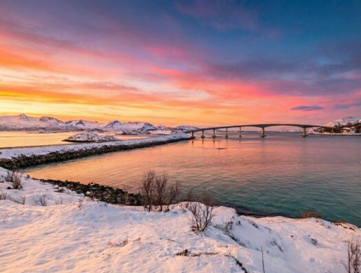 Am nächsten Tag erkundeten wir die majestätischen Fjorde und fuhren bis nach Sommarøy. Die kleine Insel Sommarøya ist über eine markante Brücke zu erreichen und empfing uns mit einer Kulisse, die fast surreal wirkte. Hier darf man den Zauber des arktischen Lebens in vollen Zügen genießen: Der Blick schweift über weiße Strände und türkisfarbenes Wasser, ohne dass der Horizont eine Begrenzung findet.