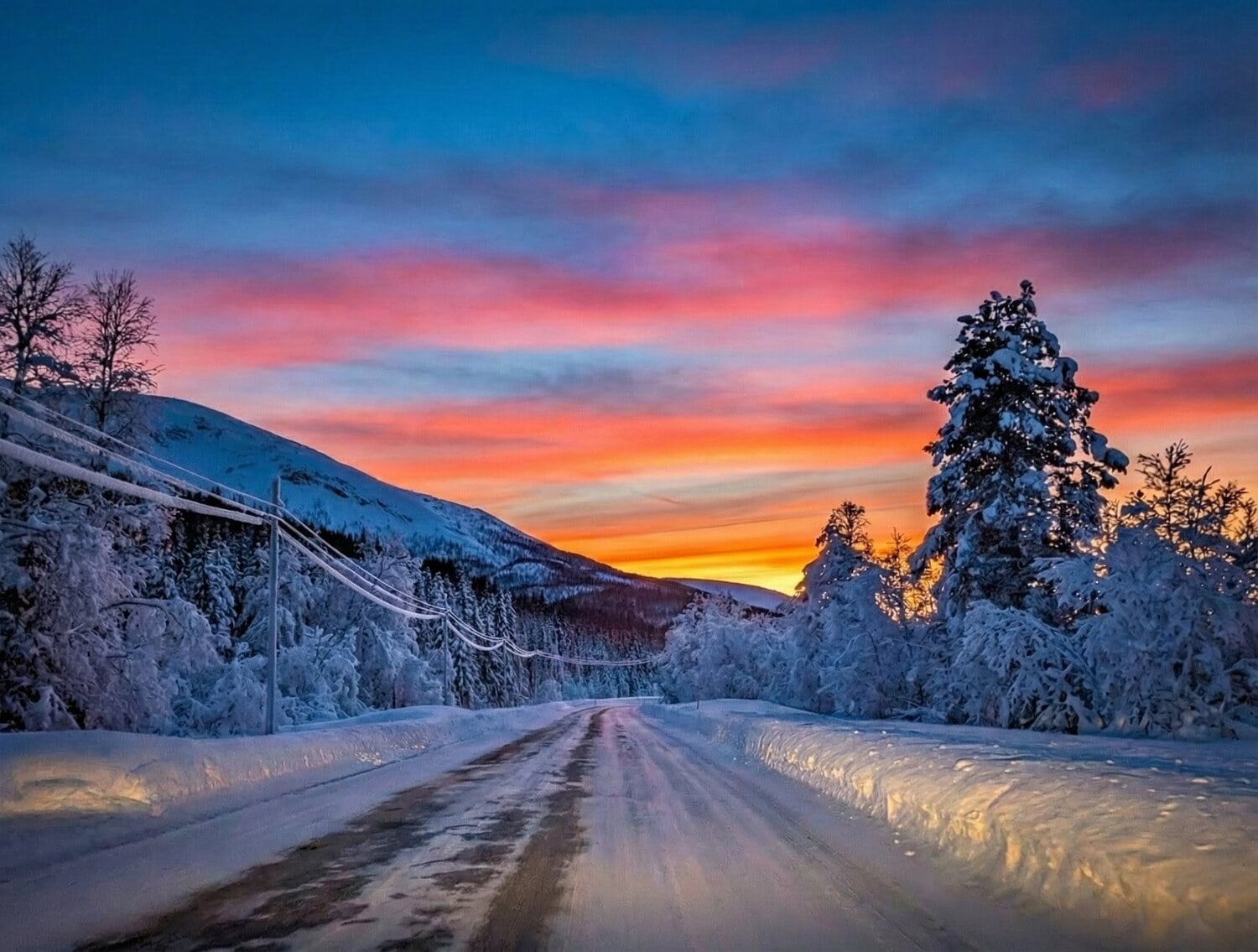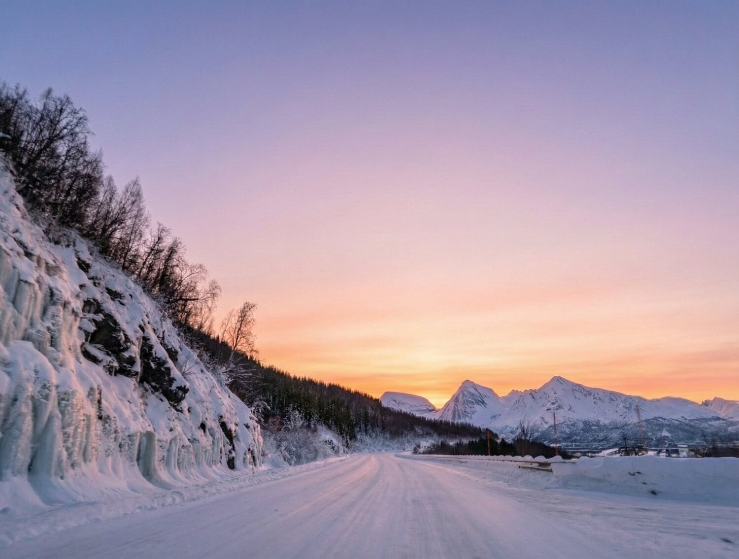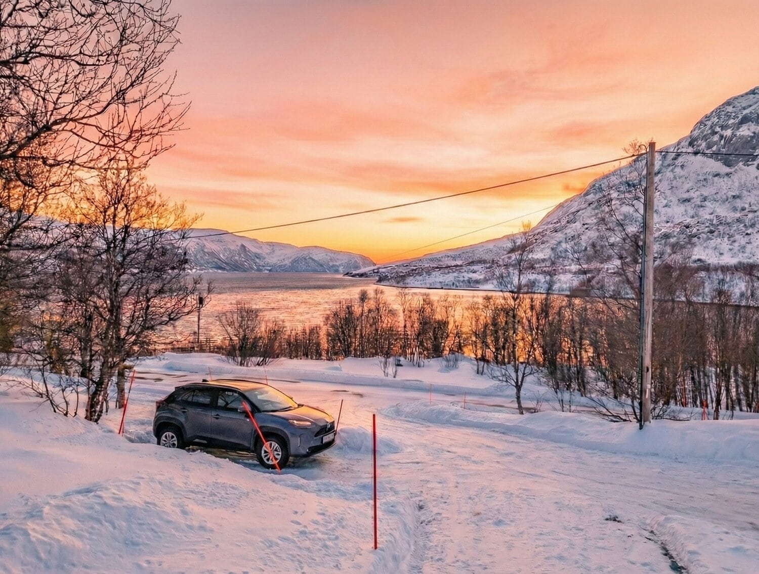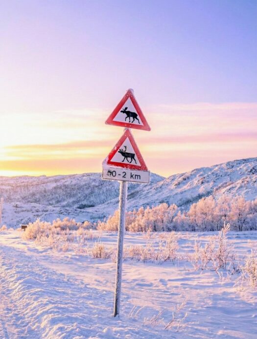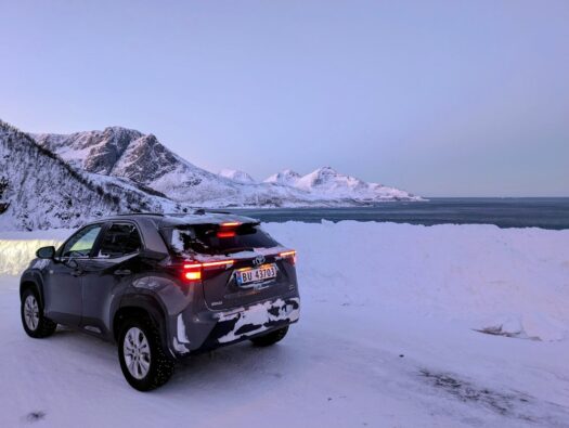 Der Rückweg von den Lyngenalpen hielt noch einmal eine beeindruckende klimatische Überraschung bereit: Je weiter wir uns von der Küste entfernten, desto tiefer sank das Thermometer. In den Bergen zeigte die Temperaturanzeige im Auto schließlich -23 Grad an. Hier machte sich die fehlende Polarmeerströmung, die Tromsø normalerweise „mild“ hält, deutlich bemerkbar. Die Landschaft war tief verschneit und erstarrt in eisiger Schönheit. ❄️
