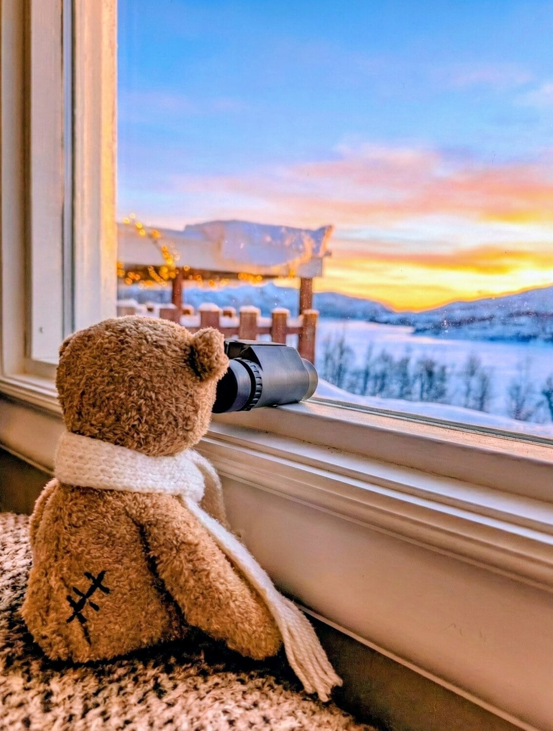Wir haben die Ruhe in vollen Zügen genossen und die wohlige Wärme im Inneren ausgekostet, während draußen die arktische Kälte die Landschaft fest im Griff hatte. Natürlich gab es aber ein wichtiges Projekt: eine ausgiebige Fotosession mit Bärle und unserem neuen Elch! In und um die Hütte herum entstanden wundervolle Erinnerungsfotos unserer kleinen Reisegruppe. Solche Pausen sind es, die eine Reise erst richtig tief wirken lassen und Raum schaffen, um all die magischen Momente der ersten Tage zu verarbeiten. ☕📸