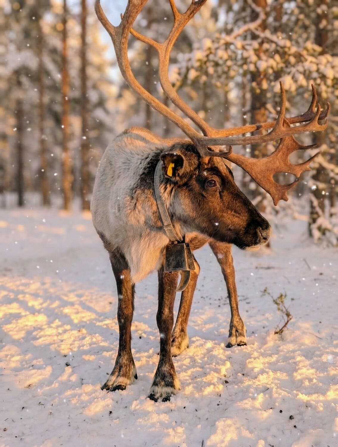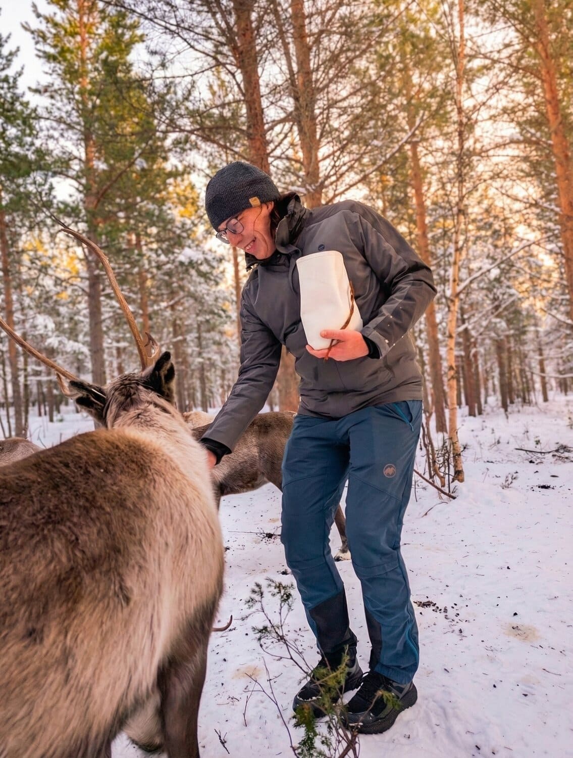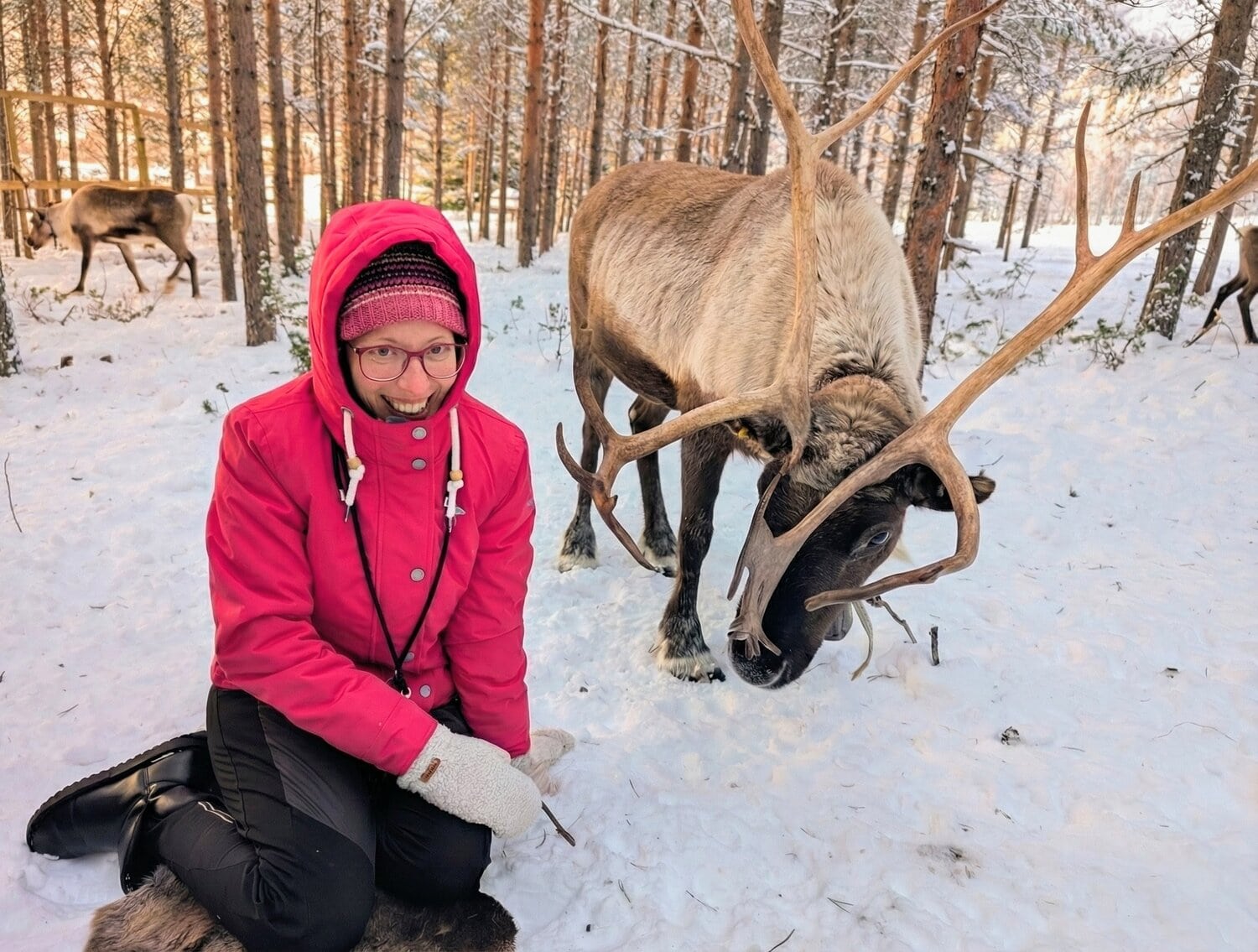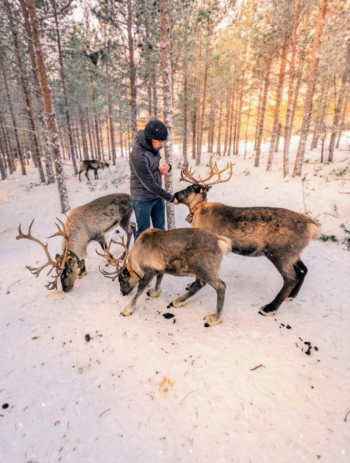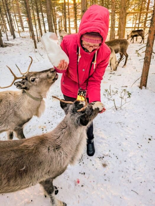 Die Rentiere waren unglaublich neugierig und kamen sofort auf uns zu. Beim Füttern gab es kein Halten mehr – wir wurden so richtig „abgeschlabbert“, was für viele Lacher sorgte. Während die Tiere danach noch emsig nach letzten Krümeln suchten, erlebten wir das eigentliche Highlight: Wir saßen inmitten der Herde im Schnee und haben gemütlich Tee getrunken.
