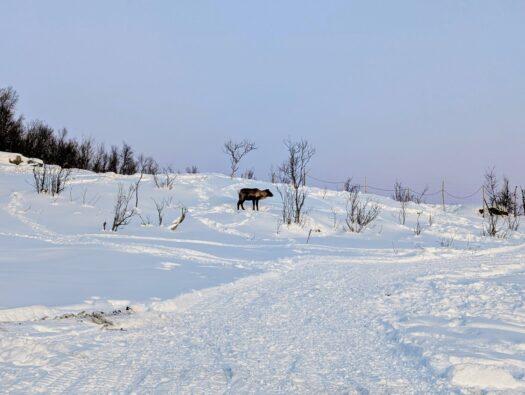 Dazwischen liegen gefrorene Seen, urige lokale Bars und idyllische Fischerhäuschen – ein Ort, an dem die Zeit scheinbar nicht existiert. Mittags kehrten wir in ein gemütliches Restaurant ein und haben dort richtig lecker gegessen, bevor wir uns langsam wieder auf den Rückweg machten. Dabei hatten wir noch eine ganz besondere Begegnung: Mitten auf der Straße tauchte plötzlich ein Rentier auf und begrüßte uns auf seine ganz eigene, nordische Art.🦌